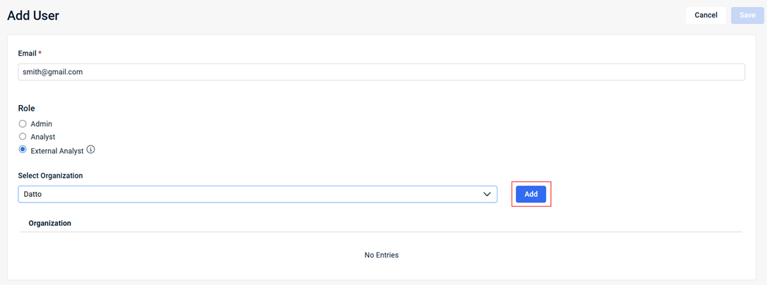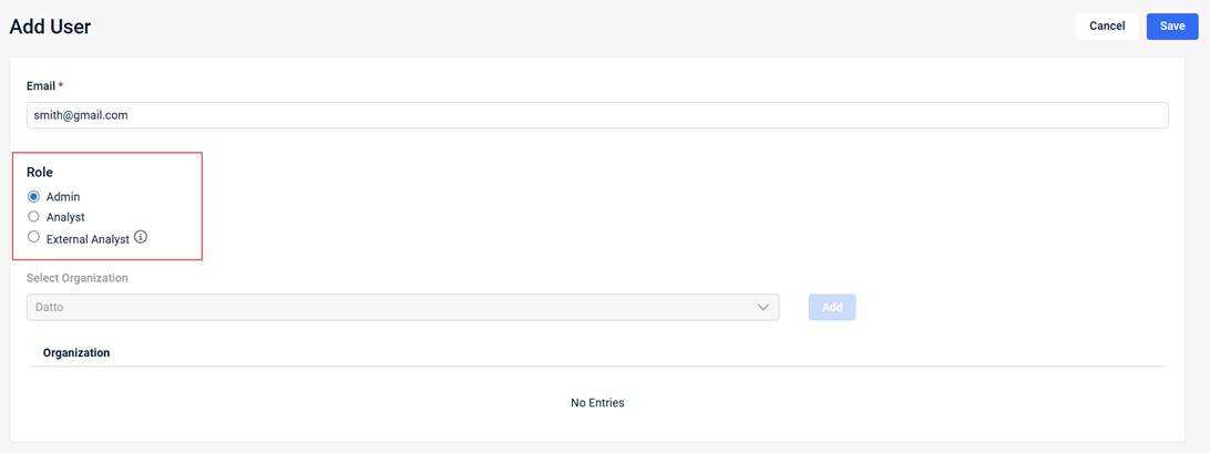 - External Analyst: Similar to an Analyst but limited to specific assigned organizations. Can view and act only within those organizations.