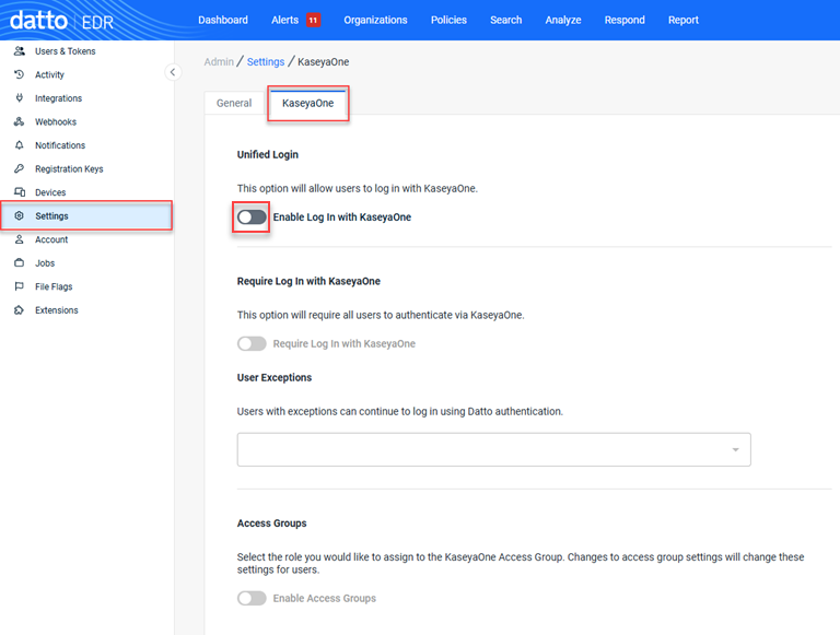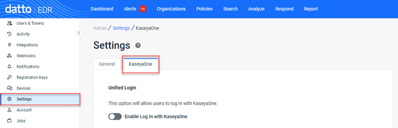 - To Enable KaseyaOne unified single sign-on, also known as unified login, you must be an administrator for both Datto EDR and KaseyaOne.