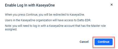 - A modal is displayed indicating that you will be redirected to KaseyaOne. Click Continue.