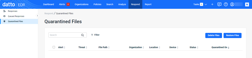 Any files that are automatically quarantined by Datto AV can be reviewed and managed by selecting Respond > Quarantined files.