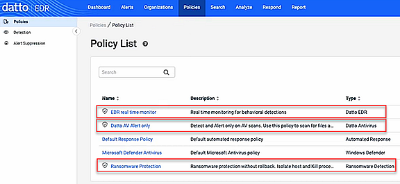 - EDR real time monitor: EDR real time monitor is an active default Datto EDR policy that performs real-time analysis and performs behavior detections.