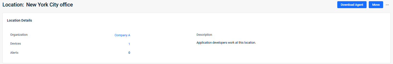 The Location details page lists all of the devices assigned to a specific location, their details, and the open alerts for each.
