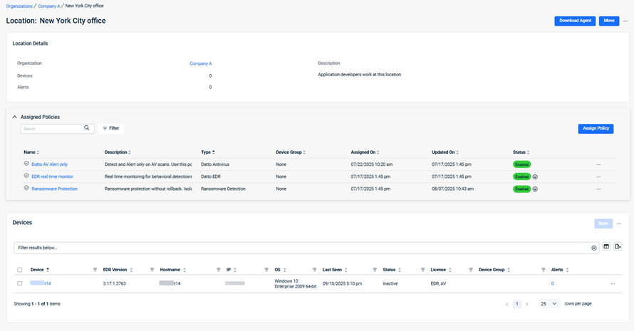 The Assigned Policies table enables you to manage the location's assigned Ransomware Detection and Windows Defender policies. Learn more in Policy List.