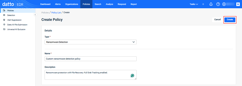 From the Policies page, you can create and customize the rules used by the analysis engine to detect threats in your environment. You can also manage your instance's ransomware, Datto AV, and Windows Defender policies and determine the actions that the platform takes when it identifies a suspected threat on an endpoint.