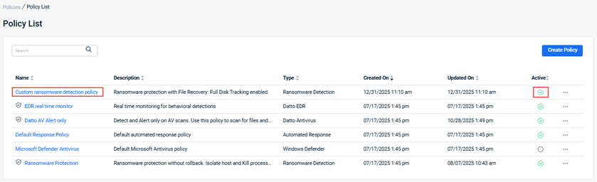 The Datto EDR, Datto Antivirus, and Ransomware Detection policies are automatically created and enabled at the MSP level. The Windows Defender and Automated Response policies are automatically created but not enabled.