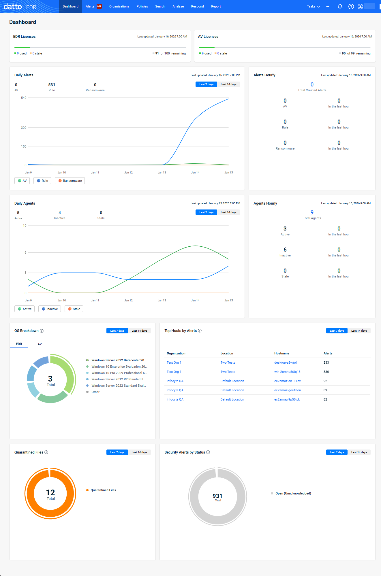 The Dashboard provides real-time and historical insights into license usage, alert activity, agent status, and overall environment health. Widgets are grouped by function and refresh at defined intervals to ensure accurate and timely visibility.