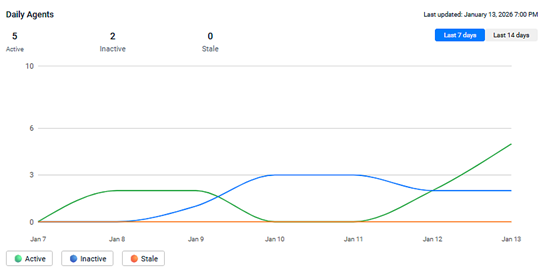 The Daily Agents widget displays a graph indicating the number of devices by agent status for each day, helping you identify agent health. You can display data for the last 7 days or 14 days.