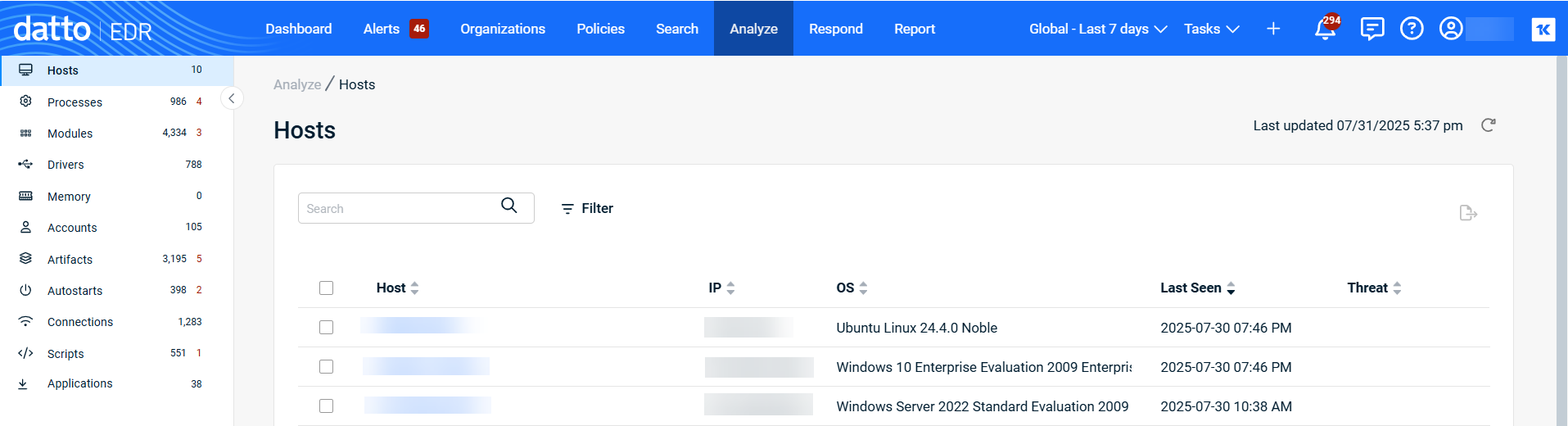 The Analyze page displays scan results for EDR scans only and is used to investigate forensic evidence of potential malicious activity. From this page, you can inspect individual hosts, processes, user accounts, and more.
