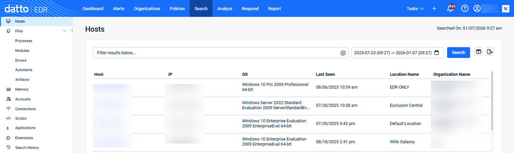 When the page loads, the Hosts page is selected by default. You can use this page to query a list of endpoints from which EDR has received telemetry data.