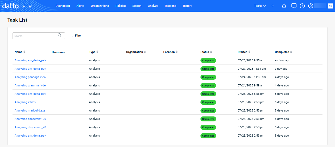 The Tasks page contains a journal of all prevention, management, analysis, and response actions initiated within your Datto EDR instance in the last 30 days. Included in the log details are the type of action carried out and by whom.