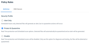 Datto DNS Secure cannot be enabled when Disable is selected for the Antivirus Policy Rule. Protect & Quarantine must be set for the Antivirus Policy Rule to ensure maximum protection alongside DNS Secure.