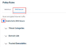 Datto DNS Secure settings are enabled in your Datto AV policy. To enable Datto DNS Secure, on the Policies page, edit an existing Datto Antivirus policy or create a new one. In the Policy Rules section, click the DNS Secure tab and select the Enable Datto DNS Secure check box.