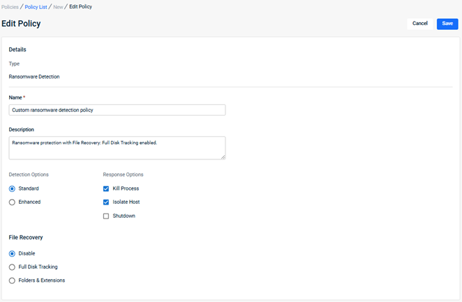 The following configuration options are available for Ransomware Detection policies. For extended details about this policy type, refer to Understanding Datto EDR's Ransomware Detection.