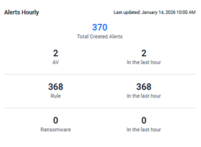 Gain real-time visibility into alert activity with the Alerts Hourly widget. This feature provides a tactical view of alert generation in your EDR instance, refreshing every hour to display the number of alerts created by source type. By monitoring hourly trends, you can quickly identify and respond to spikes tied to specific sources, ensuring faster threat mitigation.