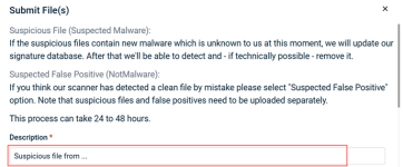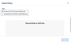 - Suspicious File: Selected by default. This is a file that you believe is a threat and you would like Datto AV to add that file's hash to our malware library. Be sure to zip and password protect the file using the password “infected.”