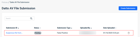 - Click the Submit button. The file is listed in the table Status of Pending. The Datto AV security engineers will evaluate the files to confirm the submission type is valid. The file hash will be returned with the disposition, and the Status will convert to Complete. The submission review process may take 24 hours.