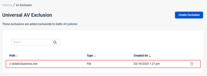The list can be inherited by any Datto AV policy by enabling Include Universal AV Exclusion within the desired AV policy.