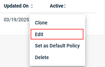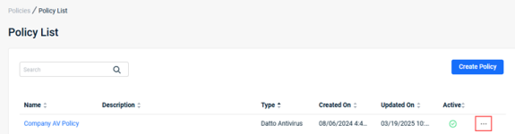 - Your Policy List is displayed. For the applicable Datto Antivirus policy, click the ellipses menu.