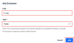 - The Create Exclusion modal is displayed. In the Path field, enter the exclusion.
