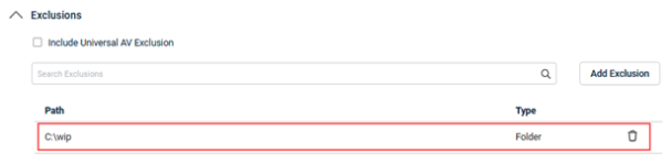 The exclusion is listed in the Universal AV Exclusion table. - To add another exclusion, repeat steps 3a-d.