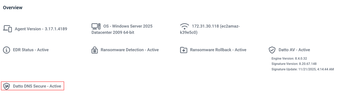 You can now view the status of Datto DNS Secure directly on the Device details page. The Overview section indicates whether Datto DNS Secure is Active, Not Installed, or Unknown, allowing you to quickly assess protection status.