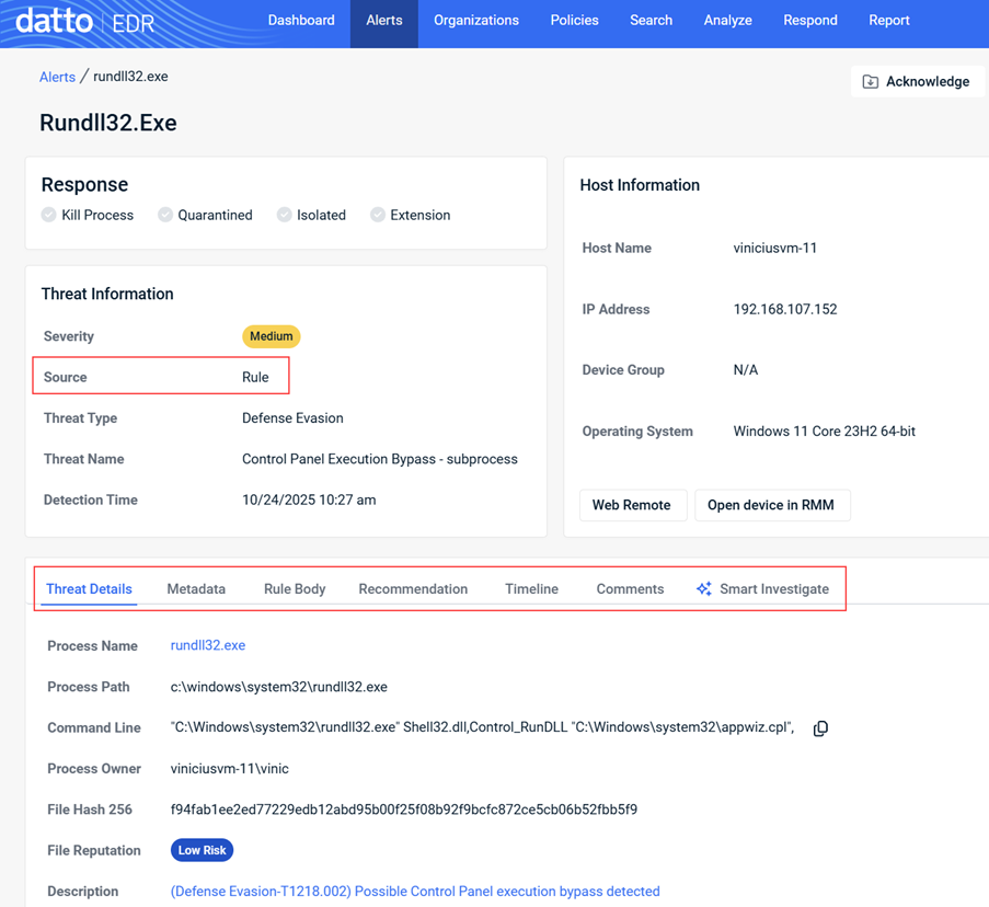 The Recommendation tab has been removed from Rule alerts on the Alerts Details page in Datto EDR. Smart Investigate now provides enhanced guidance and recommendations, simplifying the user interface.