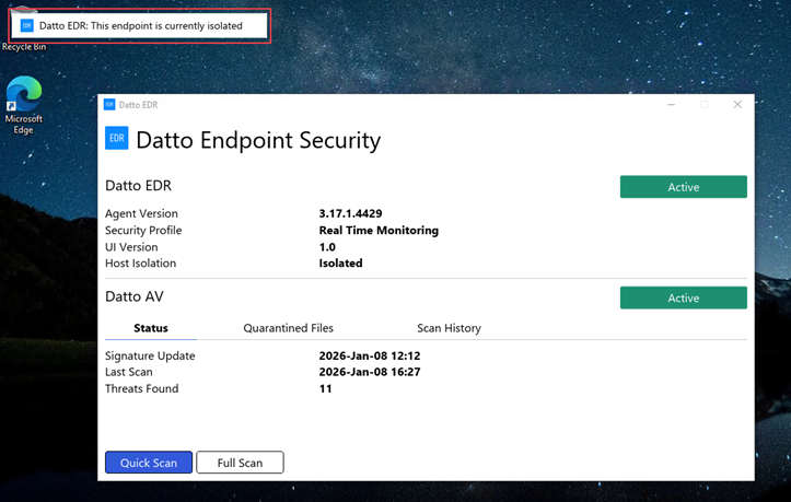 When a device is isolated by Datto EDR: The banner helps users quickly identify when a device has been placed in isolation, ensuring awareness of restricted network access. The banner only appears when the desktop UI is open or minimized.