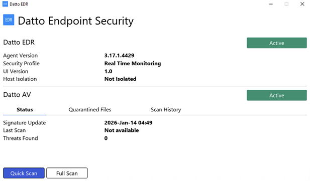 We’re excited to announce the Datto Endpoint User Interface, a new feature designed to give end users real-time visibility into their device’s security status and the ability to initiate key security actions directly from their desktop. Users can initiate scans, view threats, and monitor both EDR and AV status from a single interface.