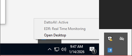 The Datto EDR agent for Windows now includes a system tray icon, giving users a clear visual indicator of agent status directly from the Windows desktop. The tray icon provides real-time feedback and is designed to improve transparency and user awareness of endpoint protection. Clicking the tray icon opens a mini menu, allowing you to launch the full desktop interface and quickly determine the Status of Datto EDR/AV.