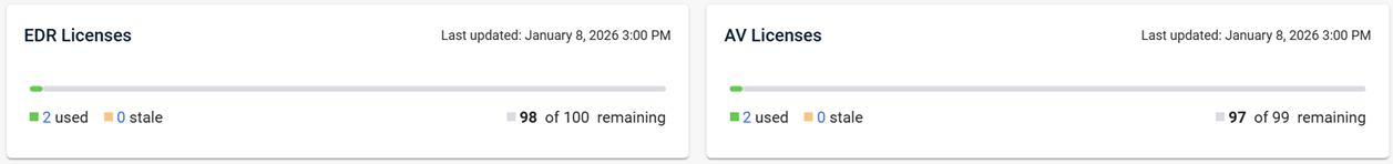 The dashboard now includes an EDR Licenses widget and an AV Licenses widget that provide a real-time overview of your EDR and AV license usage. You can view the number of licenses in use, stale licenses, and remaining licenses. Clicking used or stale counts opens a filtered Devices page. License data refreshes automatically every 4 to 24 hours, ensuring you always have up-to-date information.