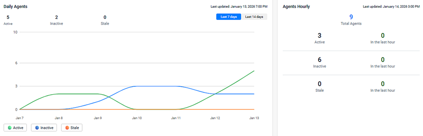 New daily and hourly agent widgets display the total number of agents by status (Active, Inactive, Stale). These widgets update automatically and allow you to drill down into device lists with a single click. This enhancement gives you greater visibility into your environment and helps you quickly identify changes in agent health and coverage.