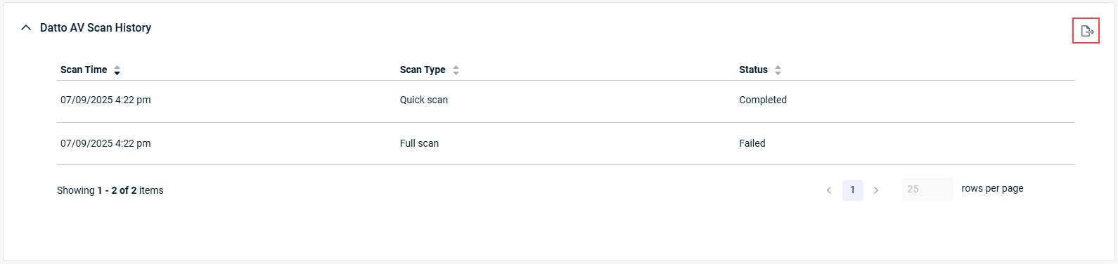 You can now view and export Datto AV scan history from the Device details page. The new Datto AV Scan History table provides a 90-day record of completed and failed scans, including Scan Time, Scan Type, and Status. Easily export this data as a CSV report for compliance or audit needs, giving you greater visibility and control over your device security posture.