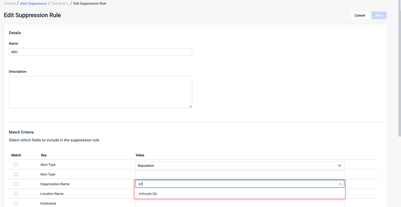 - Improved the Organization and Location drop-down lists in the Alert Suppression editor by adding type ahead filtering, making it easier to manage environments with large numbers of organizations or locations.