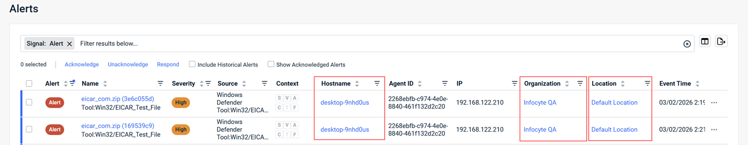 You can now navigate directly to related entity details from the Alerts table. The Hostname, Organization, and Location columns now link to the details page for the selected entity. This enhancement reduces investigation time by minimizing navigation steps.