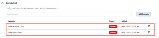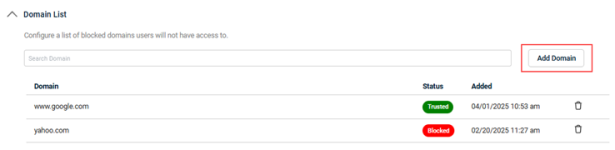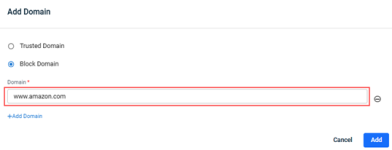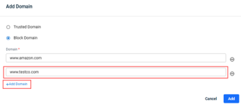 - To add another domain, click +Add Domain. In the new Domain field displayed, enter the domain's URL. Note that each domain added in this manner must be of the same type, Trusted Domain or Block Domain.