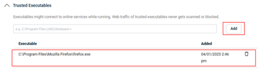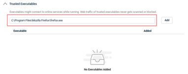 In the Trusted Executables section, you can add specified executable files that are allowed to connect to online services while running.
