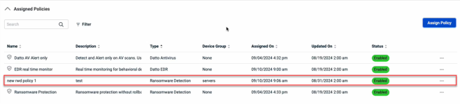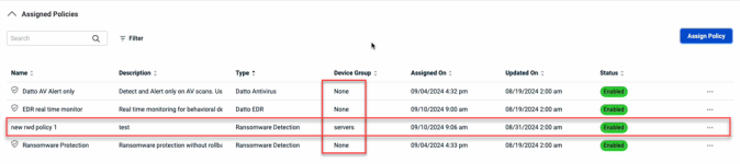 - Click the Assign button. The policy is listed in the Assigned Policies table and is assigned to the device group.