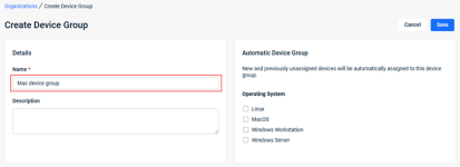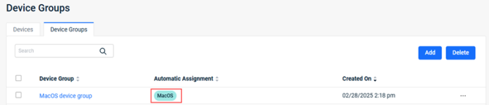 - Click Save. The group is listed in the Device Groups table. If you created an Automatic Device Group, the operating system that applies is listed in the Automatic Assignment column.
