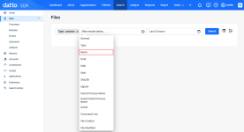 When doing a search on Files, you can click the arrow next to Files to reveal the file Type filter options. Select a type and it is listed in the Filter field. - To include additional filter criteria, click the Filter field and select another filter.