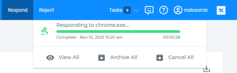 In the top navigation menu, click Tasks. You'll see a list of the most recently-queued tasks and their current status. If the action's execution finished, you'll see a Complete status indicated beneath its progress bar.