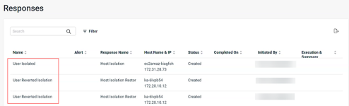Real time protection will always quarantine files and users may have accidentally set up a policy for alert only mode with Real Time protection enabled. We recommend you verify that your existing AV policies with alert only mode enabled don't have Real Time protection enabled as well. - Response items have been added to the Responses table. When a user manually isolates a device or reverts isolation on the Device Details page, the response is listed in the Responses table. Previously, only responses taken from an alert were logged in the Responses table.