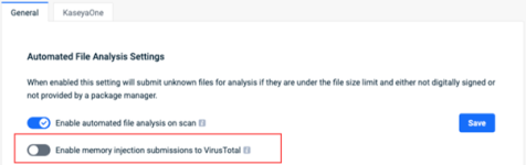 Removed the need to opt into memory submissions/ scans via the Admin Settings page. Therefore, the Enable memory injection submissions to VirusTotal option has been removed. EDR will continue to leverage 3rd party threat intelligence in memory scans while keeping submissions confidential.