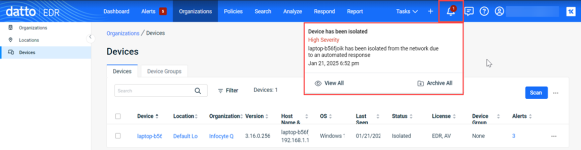 System notifications in the platform now include isolation events initiated by your Ransomware Policy.
