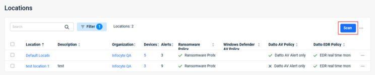We have improved the ease that EDR operators may launch a scan against devices in their estate. The Scan button is now available on the Organizations, Locations, and Devices pages so users can easily initiate a scan.