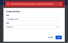 We discovered users are creating some Datto AV exclusions that will not work as expected due to improper formatting. Additional formatting checks have been implemented to help users properly create Datto AV exclusions. Therefore, formatting will be validated as you create an exclusion. If the formatting does not meet the requirements, a warning banner will be displayed, as shown in this example.