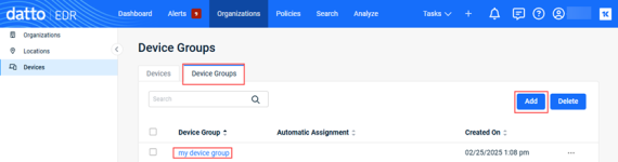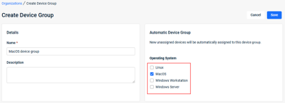 Now, when you add a new device, you can automatically assign it to a device group based on the device's operating system (Linux, MacOS, Windows Workstation, Windows Server). The Automatic Device Group feature is available when creating or editing a device group on the Organizations > Devices > Device Group page.