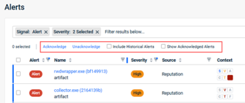 The following options are available above the table: Acknowledge, Unacknowledge, Include Historical Alerts, and Show Acknowledged Alerts.